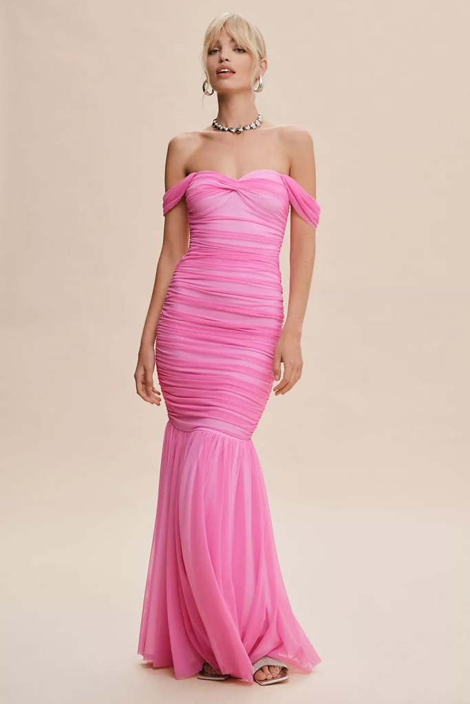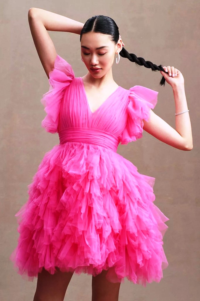 Мини-платью без бретелек особую женственность придают оборки спереди. Оно, безусловно, должно быть в гардеробе каждой девушки и особенно той, которая собирается на Barbicore-девичник. Кажется, чего-то не хватает? Конечно! Сумочки в стиле Барби и изящного, но не бросающегося в глаза, ожерелья.