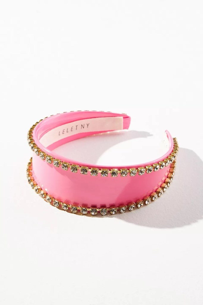 Платье выше колена обязательно обратит на себя внимание своим ярким оттенком и оригинальным вырезом в виде сердечка. Завершат образ розовая повязка на голову и минималистичное блестящее ожерелье.