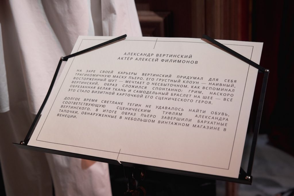 Дополнила вечер эксклюзивная выставка костюмов из сериала «Вертинский». Над образами работала Светлана Тегин — дизайнер, художник по костюмам и основатель TEGIN FASHION HOUSE. Гости смогли детально рассмотреть наряды и аксессуары, в которых в сериале предстали исполнители ролей Александра Вертинского, Веры Холодной и Марлен Дитрих, а также узнать историю их создания.