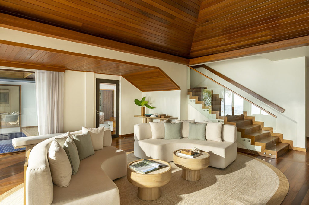 Архитектурное бюро BLINK из Сингапура, отвечающее за интерьеры виллы, создало пространство в теплых тонах с преобладанием чистых линий, природных материалов и орнаментов, вдохновленных идеальной геометричностью природы – раскидистых пальм, зыбью морской волны и причудливых узоров на песке. К услугам гостей личный помощник thakuru, исполняющий любые пожелания – от бронирования столика в ресторане и записи на спа-процедуры до организации морского круиза или романтического ужина на отмели посреди океана, поэтому беззаботный отпуск гарантирован!