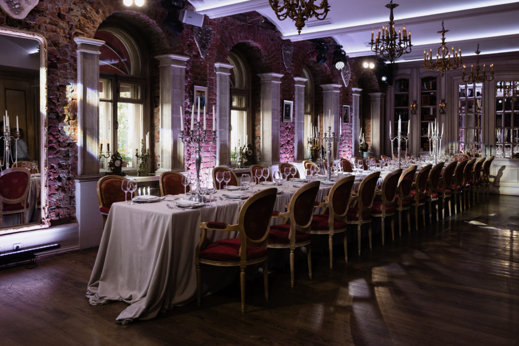 В ресторане есть 2 банкетных зала: Белый и Красный. Красный зал — это пространство, где история встречается с элегантностью, кирпичные стены и высокие арочные окна создают атмосферу старинного особняка, а винтажные люстры и французский антиквариат придают интерьеру утонченный шарм.