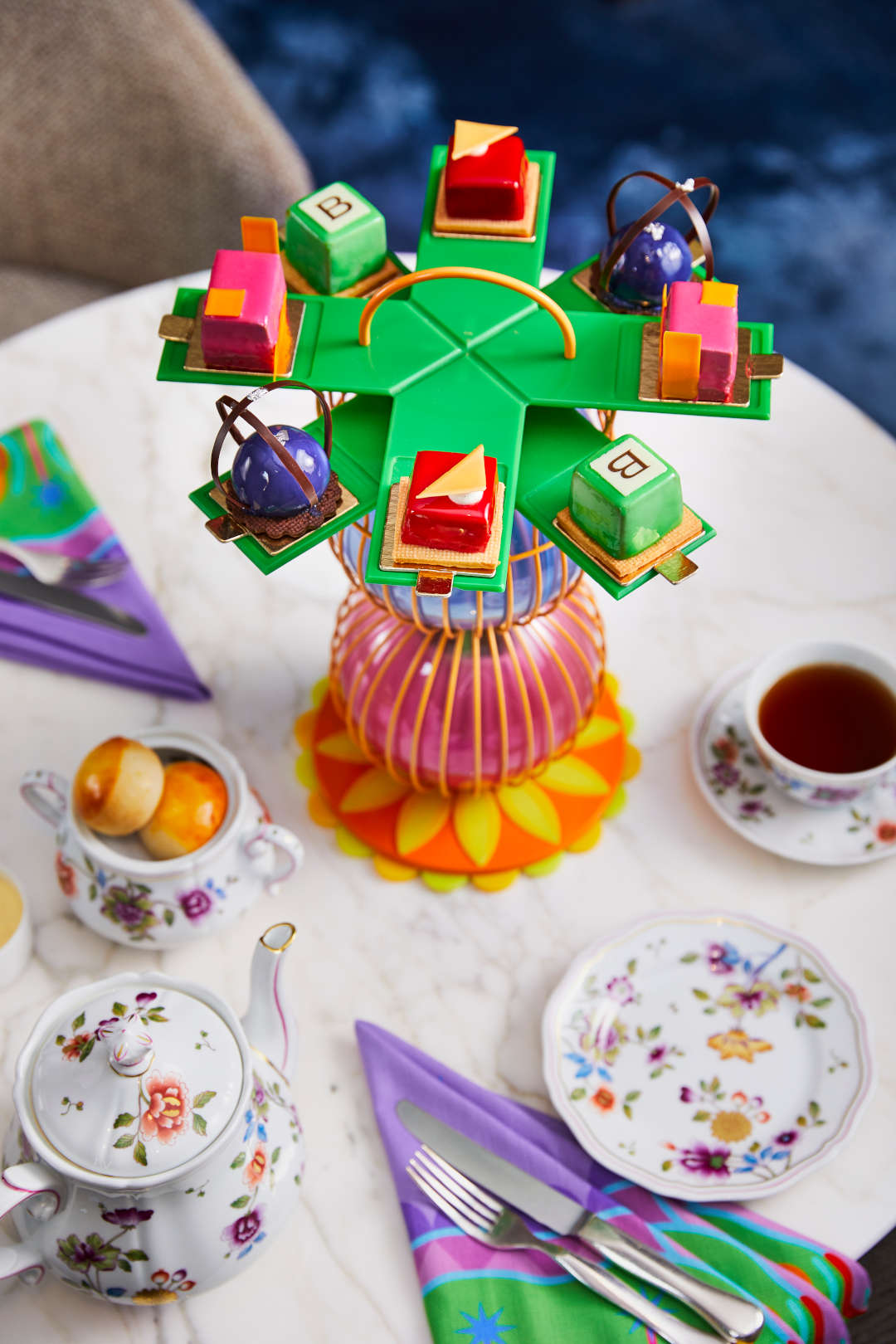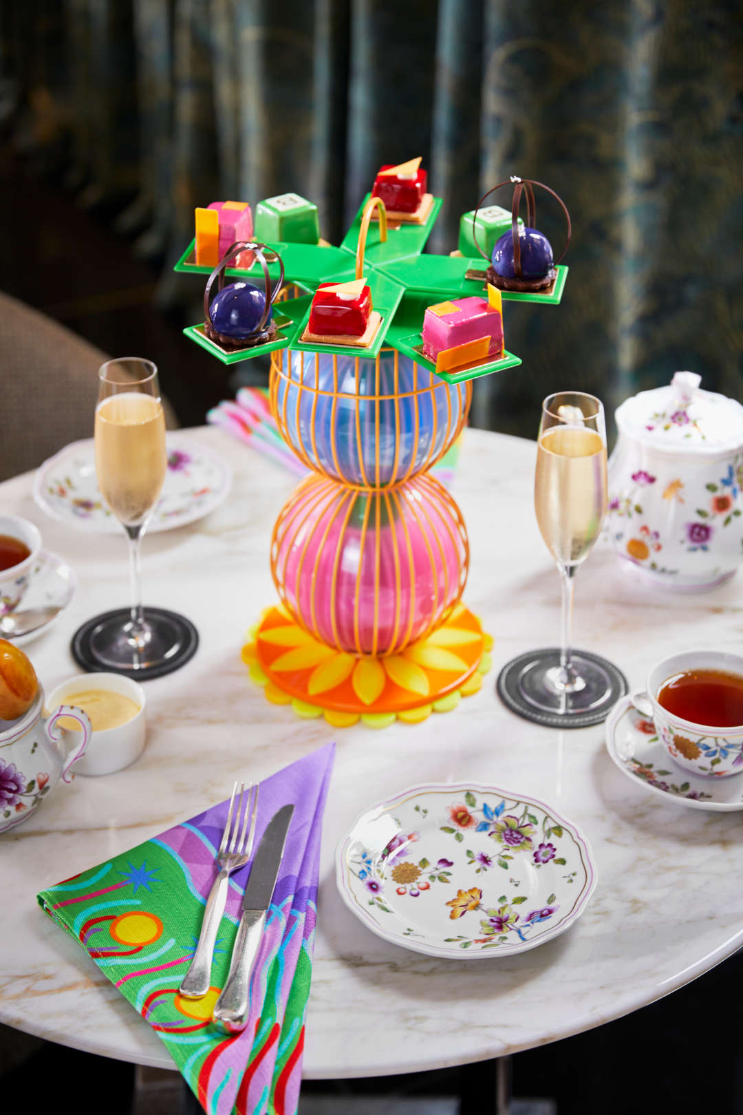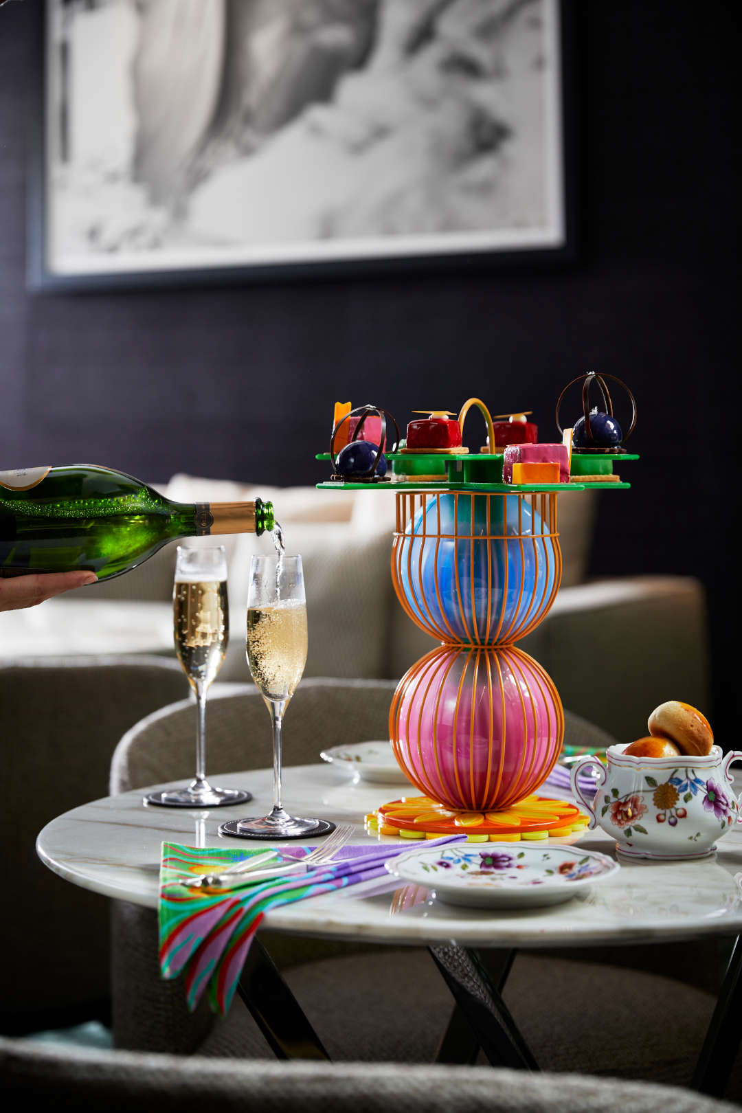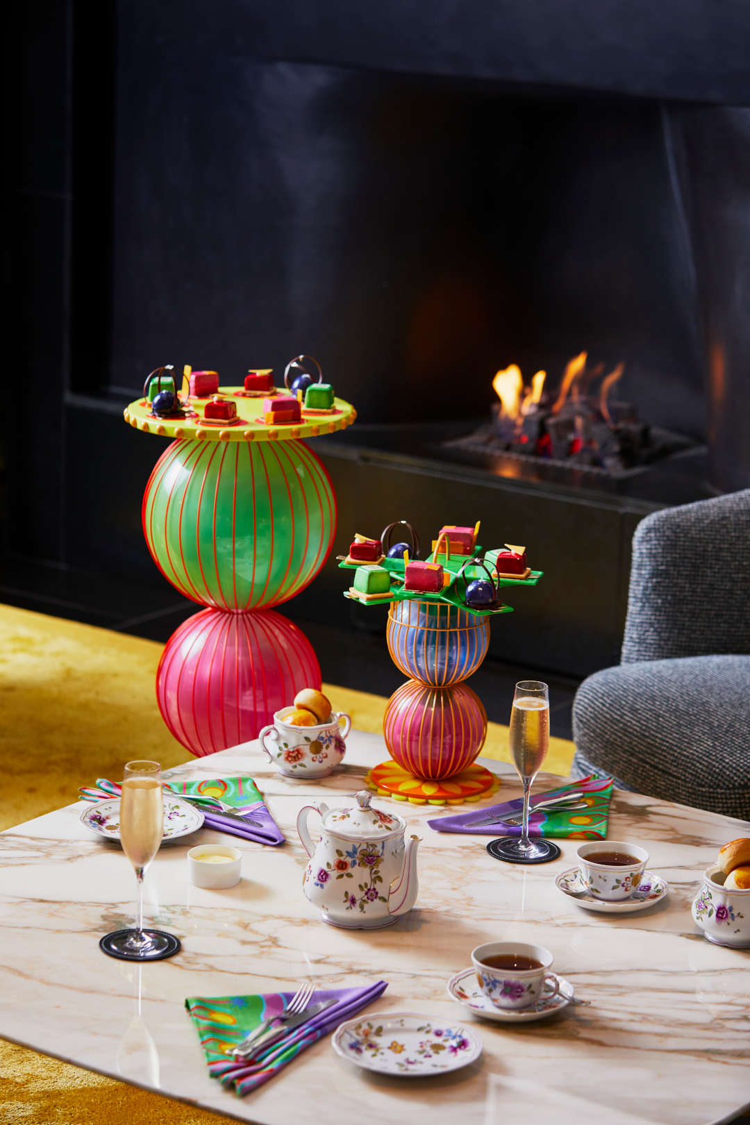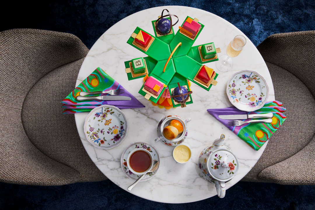 Центром внимания станут специально разработанные подставки для полуденного чая, установленные на сложенных и пересекающихся сферах. Специально созданному арт-произведению будет вторить мотив всюду в отеле — от яркого оформления фасада до льняных салфеток на столах, которые можно приобрести как подарочный набор ограниченного выпуска.